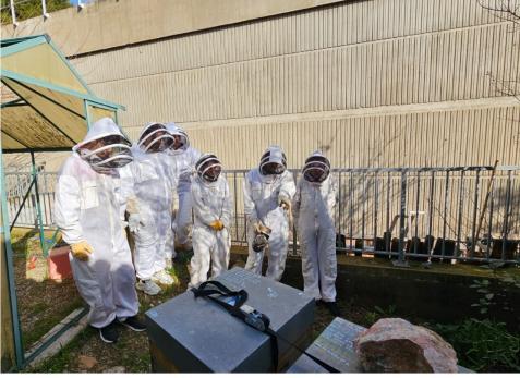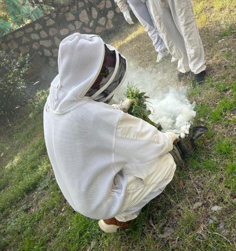 Il a terminé sa présentation au jardin où nos deux ruches sont installées. Pour cela nous avons enfilé une combinaison apicole intégrale.